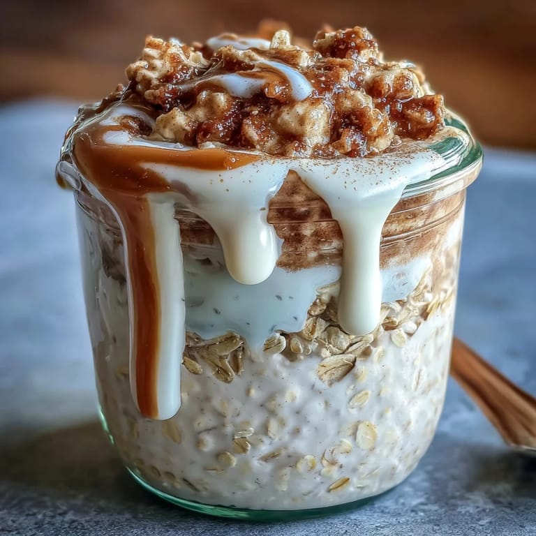 Save Start your morning with a creamy, high-protein breakfast inspired by the classic flavors of a cinnamon roll. These overnight oats combine old-fashioned rolled oats, vanilla protein powder, and warm ground cinnamon into a satisfying meal that tastes like dessert but provides a nutritious energy boost. Finished with a decadent cream cheese–style drizzle, this easy recipe is perfect for busy mornings when you want something both delicious and filling.